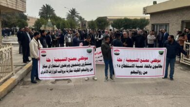 نظم عدد من موظفي معمل نسيج الحلة التابع لوزارة الصناعة والمعادن، تظاهرة سلمية أمام بوابة المعمل، احتجاجًا على استقطاع نسبة…