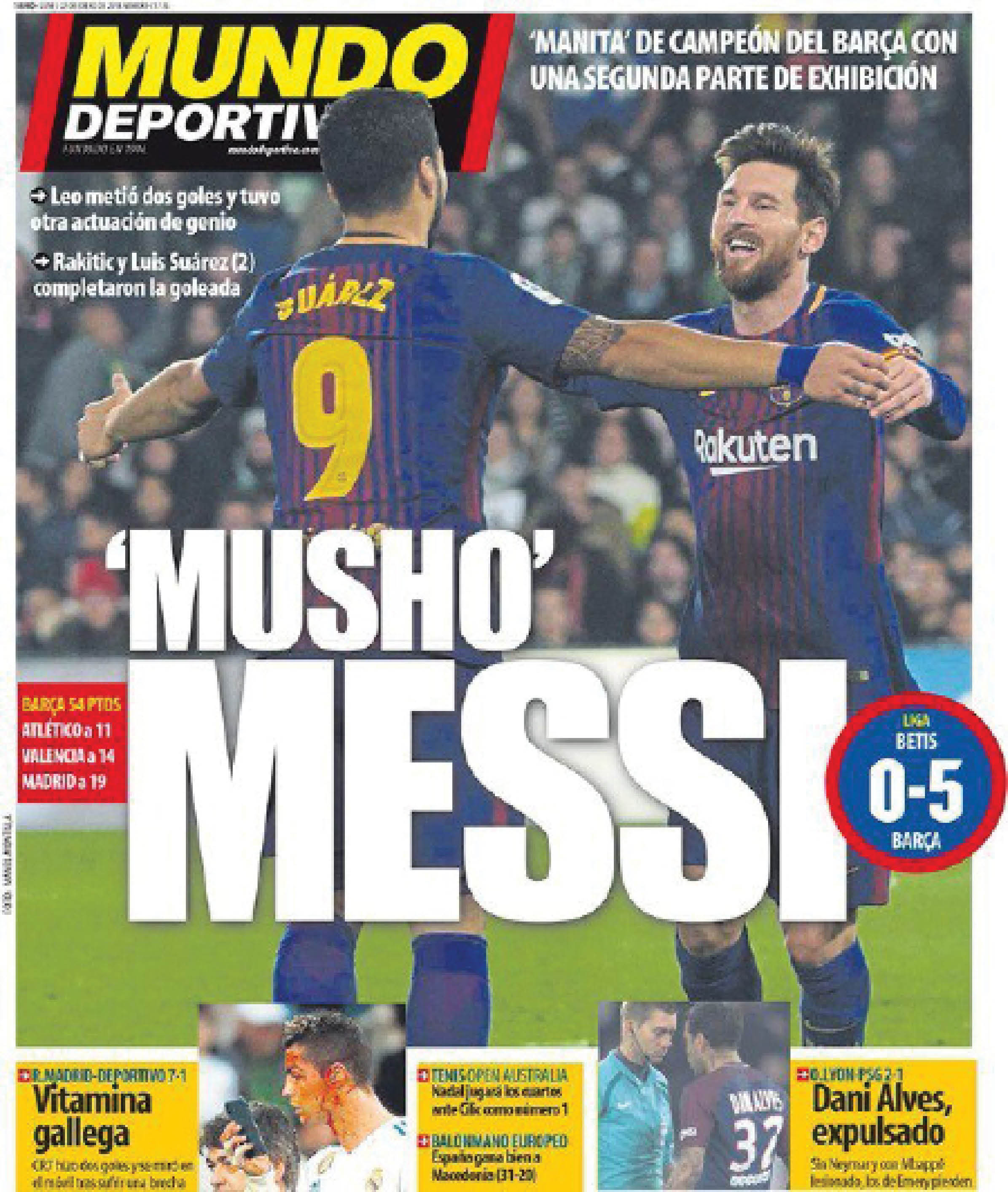 تصدرت نتائج مباريات اليوم الثاني من الجولة الـ20 من الليجا، أغلفة الصحف الإسبانية والتي حظيت بفوزين كبيرين لريال مدريد على ديبورتيفو لاكورونيا بنتيجة 7-1، وبرشلونة على ريال بيتيس بنتيجة 5-0. وعنونت صحيفة «ماركا» على صفحتها الأولى وقالت «مدريد عاد ليكون مدريد»، وتابعت «البطل يسترد روح الأمسيات الكبيرة بسباعية في مرمى ديبورتيفو لاكورونيا». وأضافت «بيل افتتح الريمونتادا التي جعلت للفريق ينتفض في البرنابيو، ناتشو وكريستيانو سجلا هدفين، وزيدان يؤكد أهمية الـ BBC». كما علقت على إصابة كريستيانو رونالدو، وقالت «رونالدو يطمئن على إصابته بنفسه، سجل الهدف الثاني وتعرض لجرح في الوجه، وطلب من الطبيب رؤية مدى حجم الجرح من خلال الهاتف». وعلى غلاف صحيفة «آس» جاء العنوان «حفلة»، و واصلت «حفنة من الأهداف في شباك ديبورتيفو لاكورونيا كانت كافية لعلاج الفقر التهديفي».وفي الأعلى تحدثت عن إصابة كيليان مبابي، لاعب باريس سان جيرمان في مباراة ليون، وقالت «بي إس جي يرتجف خوفاً من إصابة مبابي».وفي الأسفل أشارت على إصابة دييجو كوستا، لتتراجع حظوظه من اللحاق بمباراة إشبيلية في إياب ربع نهائي كأس الملك». وفي كتالونيا احتفلت الصحف بتعزيز برشلونة لموقعه في صدارة الليجا وعنونت صحيفة «موندو ديبورتيفو» وقالت «المزيد من ميسي». وتابعت «ميسي بأداء عبقري يسجل ثنائية، وسواريز وراكيتيتش يكملان مهرجان الأهداف، وبرشلونة يقترب من التتويج مع أولى مباريات الدور الثاني».