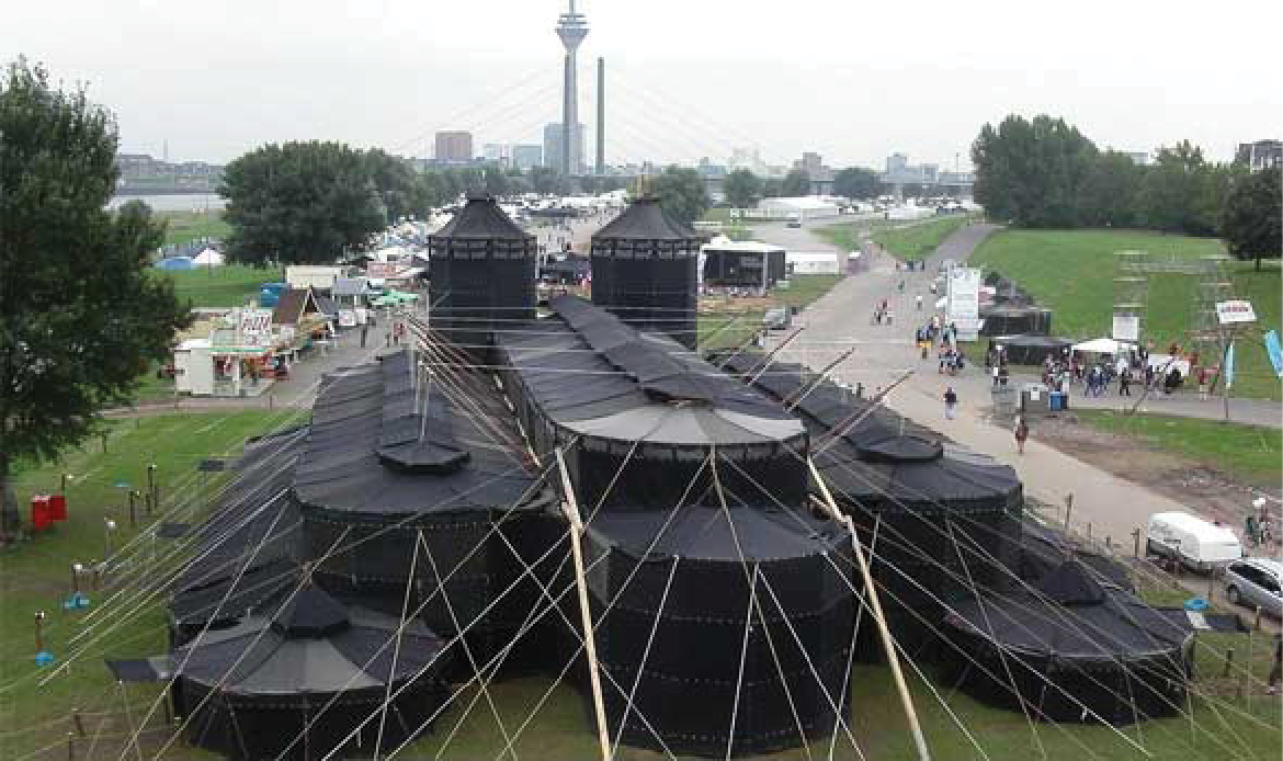 تستحقّ الخيمة الألمانية الكبيرة وصف الدراماتيكية، إذ تمّ استخدامها للاحتفال باليوم العالمي للشباب في دوسلدورف، واحتاجت إلى 40 مِن رجال الكشّافة لبنائها في أسبوع كامل. ويوجد بها جرس كنيسة مُثبّت في أحد برجيها، والذي يبلغ ارتفاعه 15 مترا، وتم استخدامها في حدث لعام 2005، حيث ورشة وللمناقشات والزوار، وكان الزوّار قادرين على الصعود إلى الأبراج ومشاهدة المناطق المحيطة. وتستخدم الخيام السود في العادة من قِبل مجموعات الكشافة في جميع أنحاء ألمانيا، وتظهر في العديد من الأشكال المختلفة المثيرة للإعجاب ولكن لا يوجد أروع مِن خيمة دوسلدورف، وساعدت «Black Castle» في بناء الخيمة، وهي جمعية للكشافة. وذكرت الجمعية: نحن مجموعة من الكشّافة من جميع أنحاء ألمانيا والذين يرغبون في بناء الخيم السود الضخمة، وهذه الخيم تقليدية للكشافة في ألمانيا، ويمكنك الجمع بين الهياكل الواحدة لخلق بناء مثير للإعجاب، مضيفة: وحين تم توجيه طلب للجمعية ببناء خيمة سوداء مثل التي كانت في يوم الشباب العالمي في العام 2005، تواصلنا مع مجموعات الكشافة لاستعارة الخيم السود. وفي حين يستغرق بناؤها أسبوعا كاملا، يتم هدمها في يوم واحد.