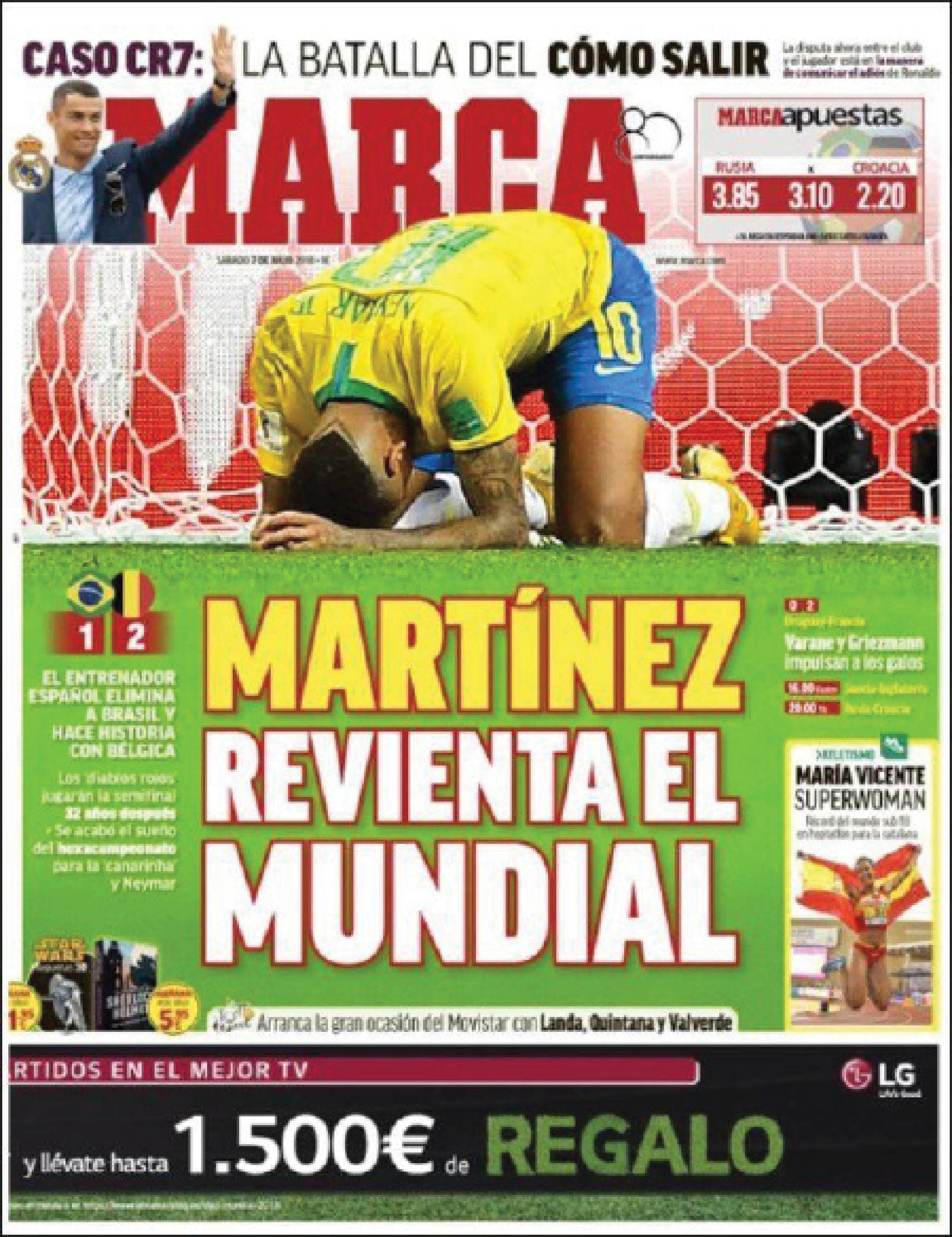 تصدر البرازيلي نيمار غلاف صحيفة «ماركا»، وهو يتحسر على خروج منتخب بلاده من مونديال روسيا بالخسارة أمام بلجيكا، وعنونت: «مارتينيز يخرق المونديال».