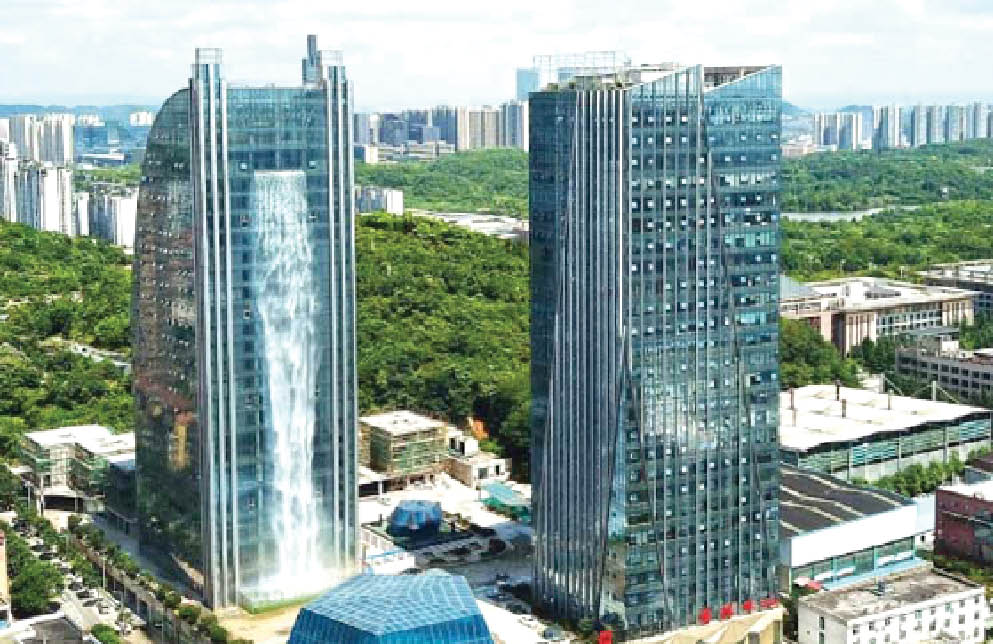 أضيفت ناطحة سحاب في جنوب غرب الصين تضم على إحدى واجهاتها شلالاً اصطناعياً هو «الأعلى في العالم» إلى القائمة الطويلة للمنشآت ذات التصميم الجريء أو الغريب في هذا البلد الآسيوي.