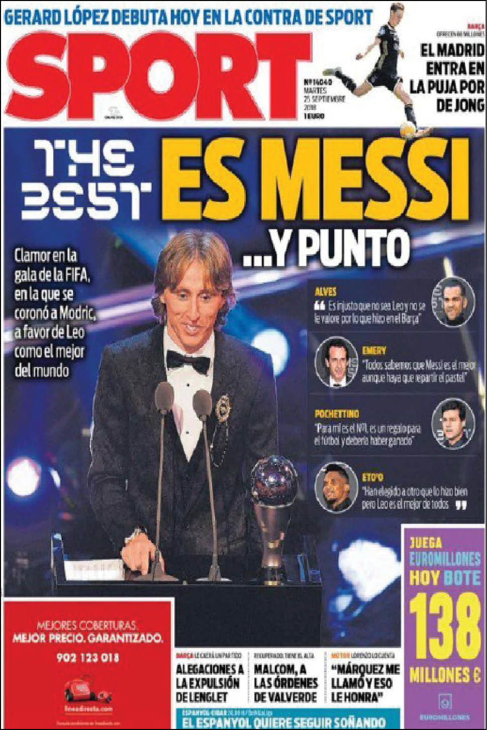 فيما خرجت صحيفة «سبورت» بعنوان «الأفضل هو ميسي.. نقطة».