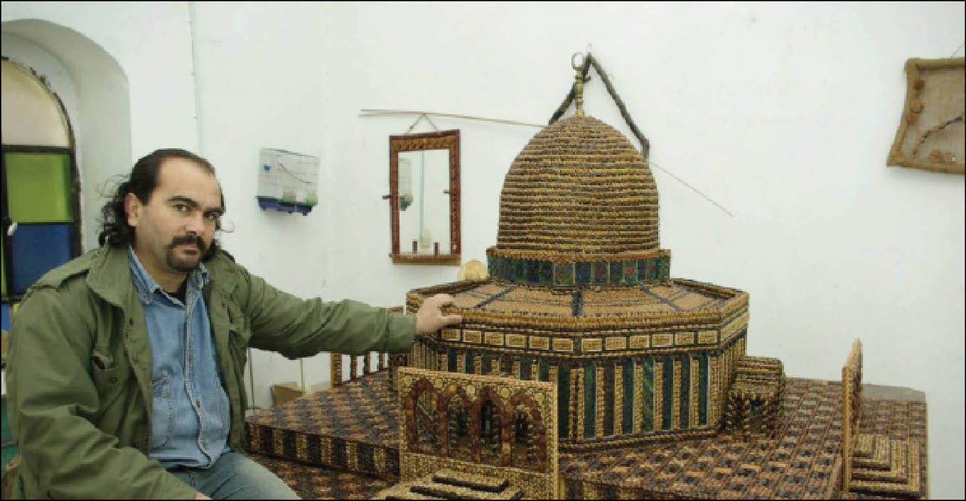 وشيئا فشيئا، تمكن من ابتكار أشكال وهياكل ملونة مبهرة لا تظهر موهبته الفنية فحسب، بل تظهر أيضا روحا تتعلق بالبيئة واهتماما شديدا بها. يستخدم الفنان الأردني البالغ من العمر 53 عاما المواد المعاد تدويرها لتشكيل أعمال فنية تعكس تاريخ بيئته الخاصة وثقافتها. ويقول، “أتجول بشكل يومي.. وفي كل جولة أتأمل الطبيعة وأجمع مخلفاتها وأعيد تشكيلها بالبيت لأكوّن منها لوحات فنية.. وهكذا تطورت الفكرة شيئا فشيئا”. ويعرض عياصرة الآن تشكيلة متنوعة من أعماله الفنية في معرض بدائرة المكتبة الوطنية في عمّان. وتضم مجموعته الضخمة هيكلا لقبه “الصخرة” استخدم فيه ما يقرب من نصف مليون بذرة من بذور الزيتون والتمر، وفسيفساء زجاجية ملونة. واستغرق الأمر من عياصرة ثلاث سنوات لإكمال البناء المبهر. وبسبب حجمه الكبير، دعا عياصرة أشخاصاً من 17 دولة عربية وأجنبية لإرسال بذور الزيتون والتمر إليه. يقول، “مجسم القمم العملاقة المقتبس عن قبة الصخرة، مرصع تقريبا بنصف مليون بذرة زيتون وتمر، ومزين أيضا بقطع الفسيفساء الزجاجية، كلها من مخلفات من أعمال الزجاج، زينته أيضا بقشور البيض، انطلقت الفكرة من مجسم صغير ونجحت الفكرة ففكرت أن أطور العمل ليكون أشبه بمعجزة فنية”. ويحمل عياصرة في وجدانه رسالة واحدة هي حماية البيئة والحفاظ عليها. ويقول، “الرسالة هي الحفاظ على البيئة، أنا لا أبدع أعمالا فنية فقط بل أدعو إلى الحفاظ على البيئة من خلال تدوير مخلفاتها الصلبة التي تلوث الطبيعة.. شوارعنا ممتلئة بأوراق وأكياس وبقايا فضلات بشرية مزعجة”. ويقول عياصرة وهو أب لخمسة أطفال إنه يشجع أبناءه على الحفاظ على عاداته وتقاليده في حماية البيئة. ويضيف، “لا يوجد شيء اسمه نفايات في بيتي، أقوم بتجميع كل ما يتلف ولا يعد صالحا للاستخدام المنزلي لأقوم بتحويله إلى أشكال فنية فائقة الجمال، إلى الحد الذي أصبح الناس يطلبون مني شراء هذه التحف”.