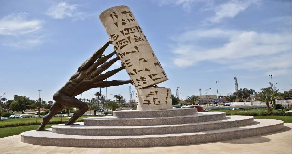 بينما يجهد التمثال «الجماد» بأيديه الاربعة للمحافظة على اسطوانة الثقافة المملوءة بالحروف المسمارية التي ترمز لحضارة وعراقة بلاد وادي الرافدين، من الانهيار بعد ان تداعت احدى أركانها – في رمزية الى تحديات الثقافة التي مر بها العراق على مر العقود الماضية ومازال- جاء الانسان «الحي» ليزيد الثقل على كاهل التمثال «المسكين» بعد ان ملأ اسطوانة الثقافة بالجهل، وغطّت العبارات الهابطة الحروف المسمارية.