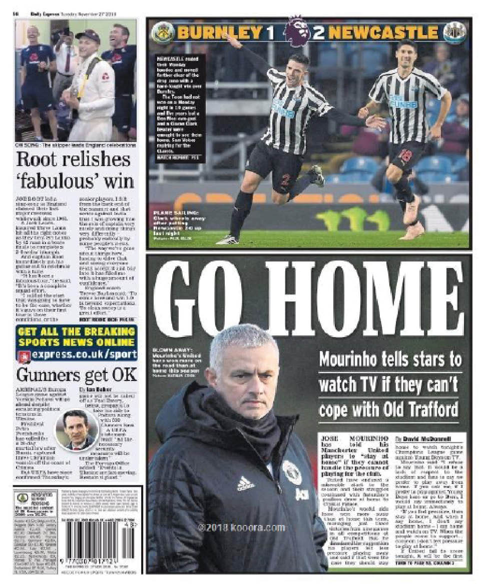 وجاء على غلاف صحيفة «إكسبريس» «اذهب إلى المنزل.. مورينيو يطالب النجوم بمشاهدة التليفزيون إذا لم يتمكنوا في التعامل مع الضغط في ملعب أولد ترافورد.» وأضافت الصحيفة «آرسنال يحصل على الموافقة» وذلك من أجل اللعب في أوكرانيا أمام فورسكا بولتافا، بسبب المشاكل السياسية في البلاد». واهتمت أيضًا صحيفة «ميرور» بتصريحات مورينيو حيث عنونت:» جهاز التليفزيون.. مورينيو يخبر نجومه بأنه من لا يستطيع تحمل الضغط في ملعب أولد ترافورد، عليه الذهاب إلى منزله ومشاهدة المباراة في التليفزيون». وأضافت: «جوارديولا يقول إن الكثيرين يرون السيتي ناديا فاشلا، في حالة عدم تحقيق الفوز في أوروبا». أما صحيفة «تيليجراف» فكان اهتمامها في كرة القدم بنقل تصريحات لوك شاو حيث قال: «لاعبو مانشستر يونايتد يحتاجون إلى جلد سميك من أجل التعامل مع مورينيو».