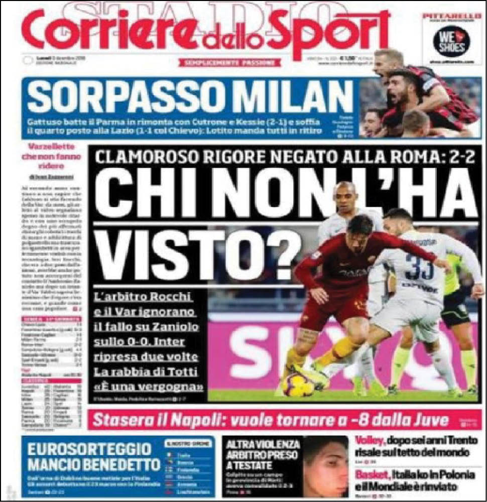 سلطت الصحف الإيطالية الضوء على حالة الجدل التي شهدتها مباراة روما وإنتر ميلان، بعد رفض الحكم، احتساب ركلة جزاء للذئاب. وخرجت صحيفة لاجازيتا ديللو سبورت بعنوان «ميلان وعبور مزدوج مع كوتروني وكيسي، المستقبل هنا، عادوا أمام بارما وارتقوا للمركز الرابع». وأضافت «روما وإنتر 2-2 مع الكثير من الجدل، أخطاء تقنية الفيديو، الحكم لم يحتسب ركلة جزاء لروما.. توتي يقول: وصمة عار.. وسباليتي يرد: وماذا عن كرة إيكاردي؟». وتابعت «قطار يوفنتوس، وصل رصيده إلى 40 نقطة، كريستيانو رونالدو ملك الأهداف في 2018». ونوهت «إيطاليا تبتسم مع المدرب مانشيني.. قرعة تصفيات يورو 2020 جيدة نسبيًا».
