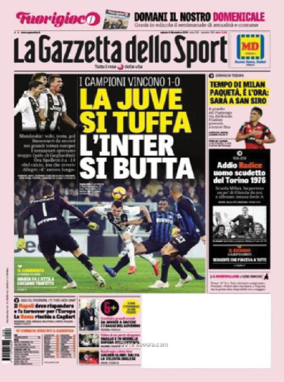 وعنونت صحيفة «لاجازيتا ديللو سبورت»: «يوفنتوس يقفز، وإنتر يبقى بعيدًا، اليوفي يفوز 1-0 وماندزوكيتش يطير ويسجل بالرأس.. الآن سباليتي يبقى بعيداً عن السيدة العجوز بفارق 14 نقطة».