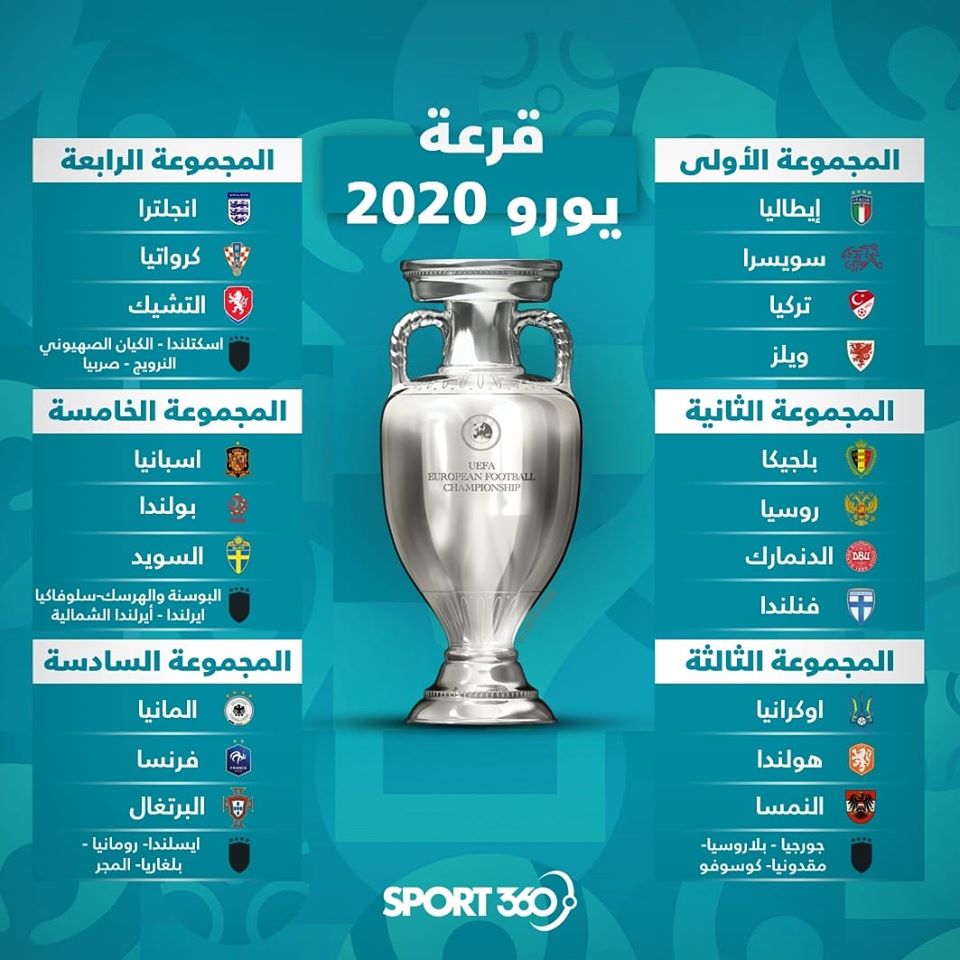 أفرزت قرعة كأس أوروبا 2020 لكرة القدم التي سُحبت في بوخارست، مجموعة نارية ضمت البرتغال حاملة اللقب، فرنسا بطلة العالم وألمانيا المتوجة 3 مرات وإحدى الدول المضيفة، فيما ستلتقي كرواتيا وصيفة بطلة العالم مع انكلترا في إعادة لنصف نهائي مونديال 2018.