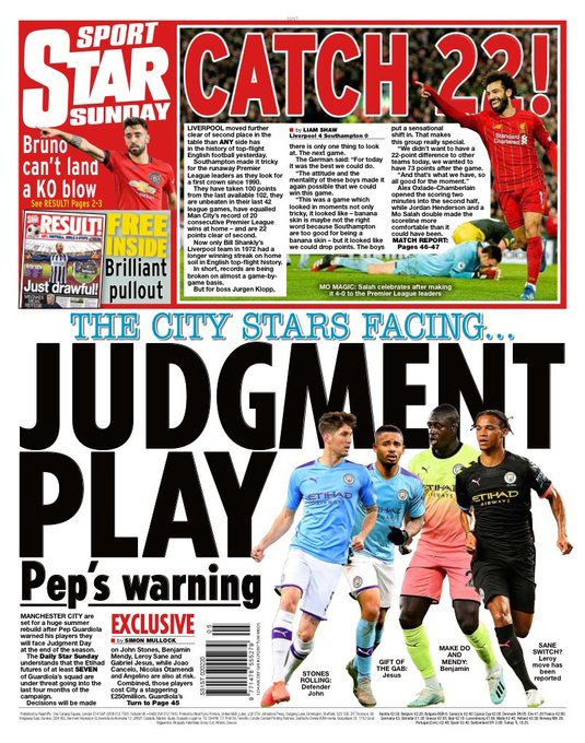 وعنونت صحيفة “ستار سبورت”: “نجوم السيتي يواجهون لعبة الحُكم بتحذير من بيب”، وذلك في إشارة إلى استعداد مانشستر سيتي لإعادة بناء الفريق بقوة الصيف المقبل بعد تحذير من غوارديولا بأن نجوم الفريق سيتعرضون للحكم على مستواهم في نهاية الموسم.