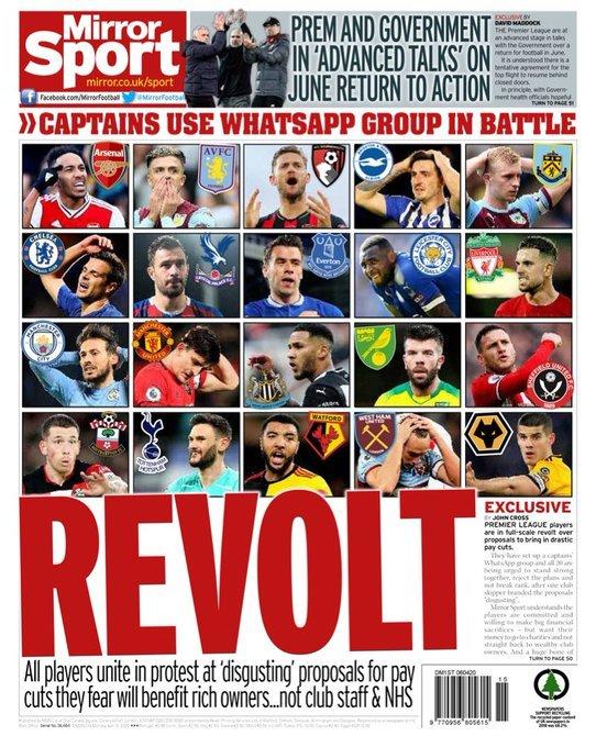 أما صحيفة “ديلي إكسبريس” فكتبت: “نقف متحدون.. قائدو الأندية يقودون تمرد ضد طلبات أندية البريميرليج بتخفيض الأجور”.