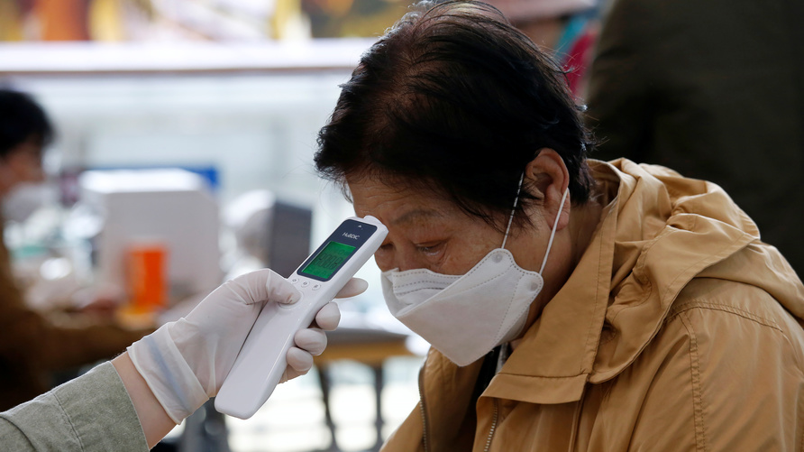 A woman wearing a preventive face mask has her temperature checked, as a safety measure to prevent the further spread of the coronavirus, before casting a ballot for parliamentary elections at a polling station in Seoul, South Korea, April 10, 2020. REUTERS/Heo Ran