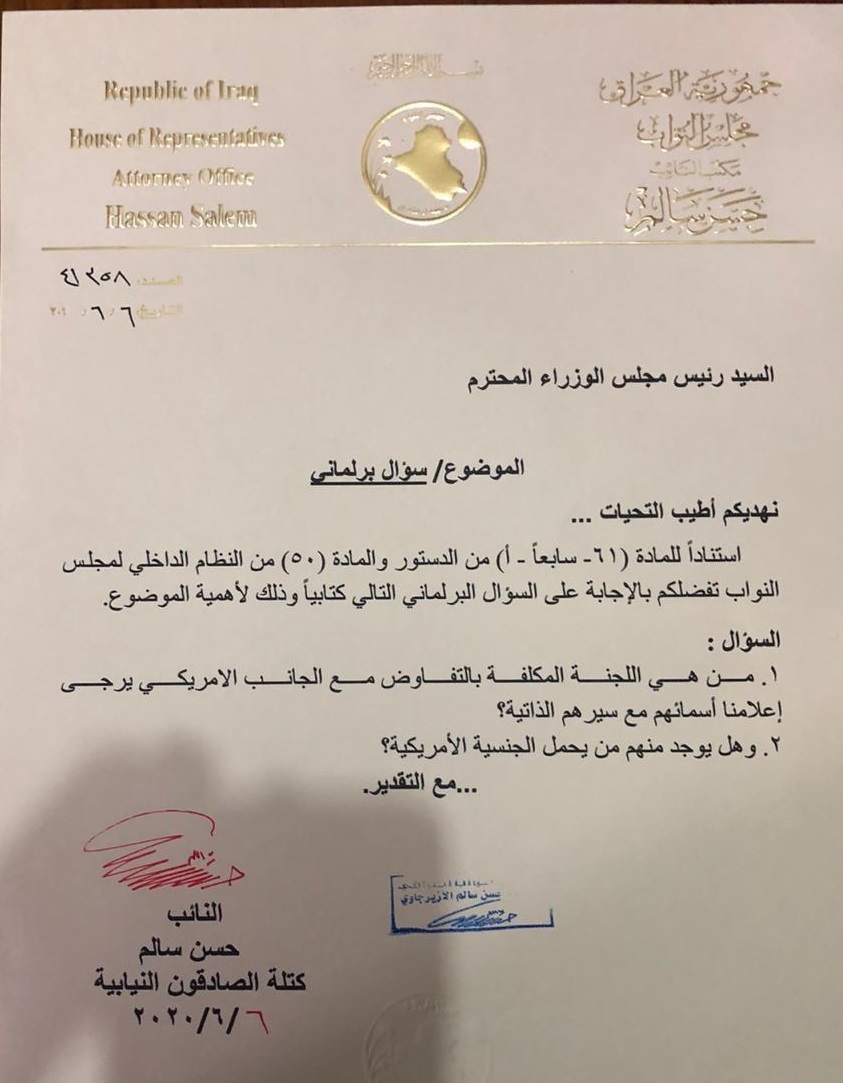 وجه النائب عن كتلة الصادقون النيابية حسن سالم، اليوم السبت، سؤالاً برلمانياً إلى رئيس مجلس الوزراء مصطفى الكاظمي حول اللجنة المكلفة بالتفاوض مع الجانب الامريكي في حوار حزيران ضمن اتفاقية الاطر الاستراتيجية.