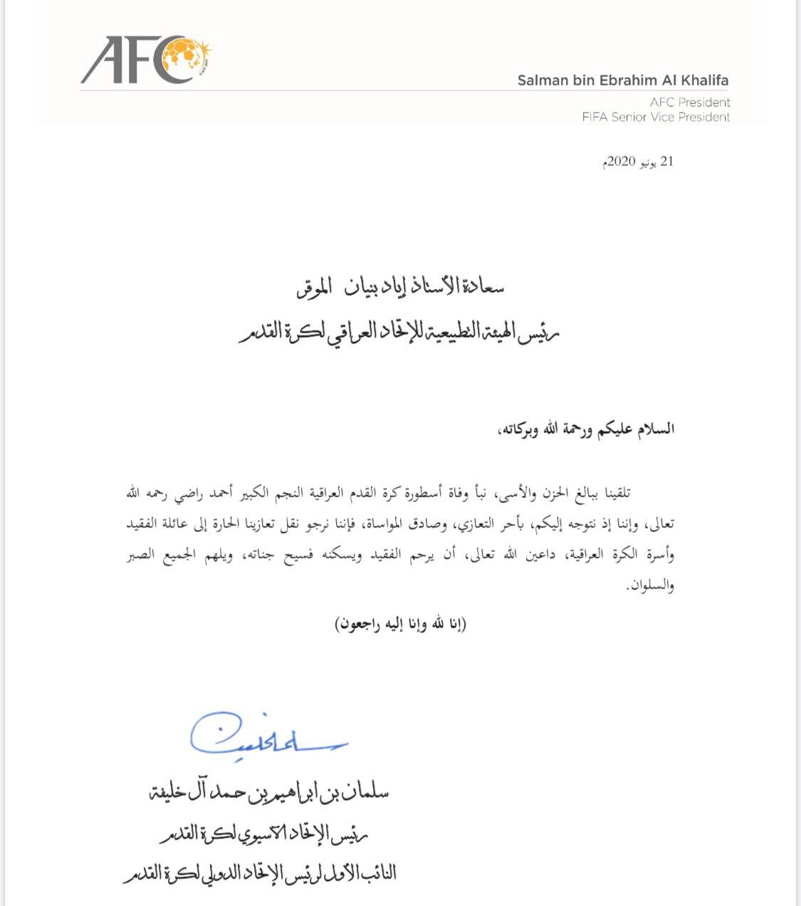 وقال آل خليفة في تصريح عبر موقع للاتحاد الآسيوي: “تشعر أسرة كرة القدم الآسيوية بالحزن الكبير لوفاة أحد أهم رموز كرة القدم العراقية، ونحن نقف إلى جانب أسرة الفقيد أحمد راضي، والاتحاد العراقي”.