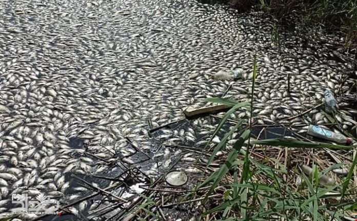 شهد مبزل الرزازة الرئيسي في كربلاء نفوق آلاف الأسماك بسبب مجاري الصرف الصحي.