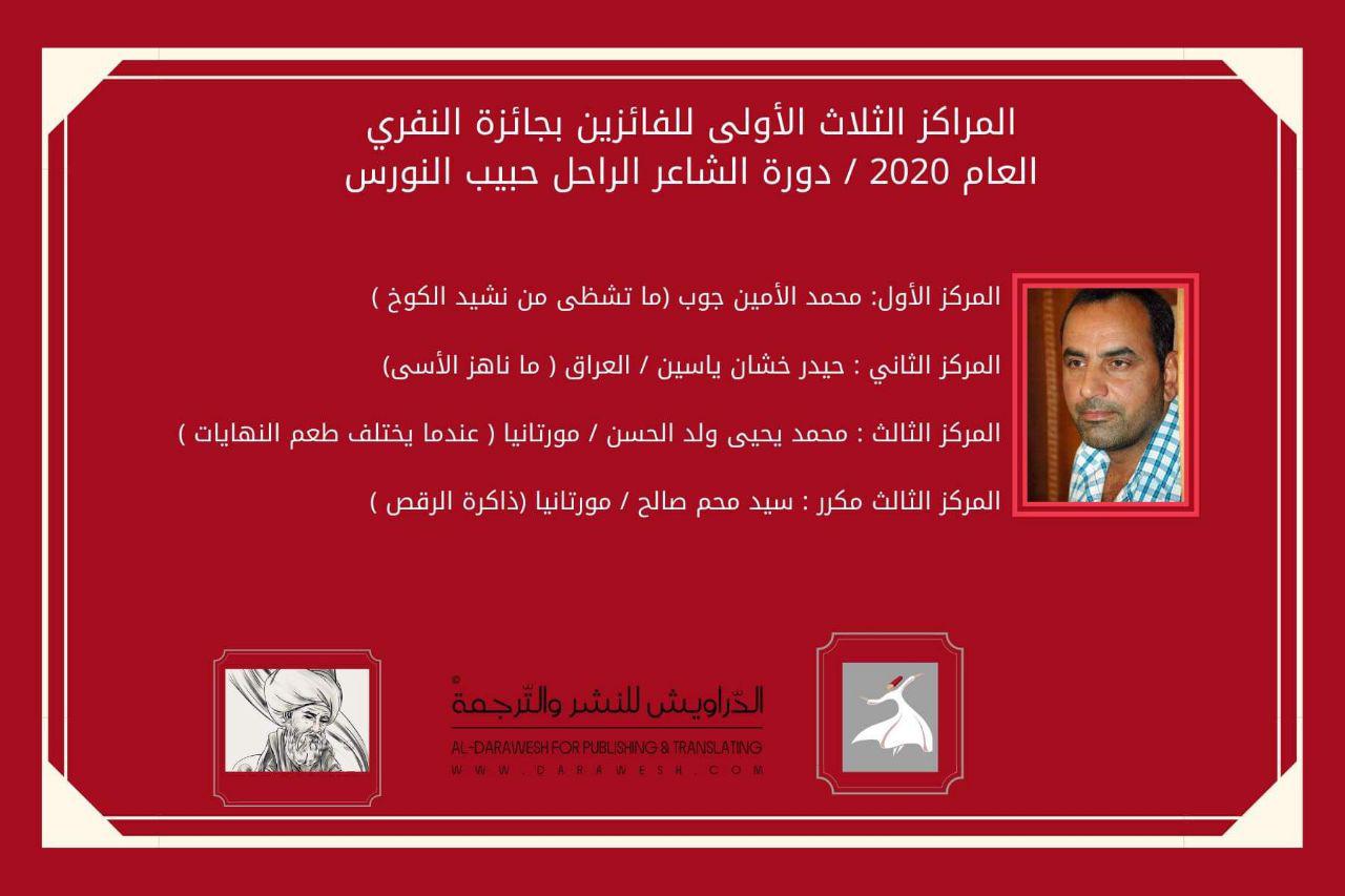 وقال رئيس تحرير مجلة الدراويش الشاعر هلال كوتا في تصريح لـ(المراقب العراقي): أن اللجنة المنظمة للجائزة التي ترعاها (مجلة الدروايش التابعة لدار الدراويش للنشر والترجمة) واللجنة التحكيمية للجائزة ، اعلنت عن اصحاب المراكز الثلاث الأولى ، حيث بلغ عدد الفائزين اربعة شعراء تقاسموا المراكز الثلاث الأولى وجاء في المركز الاول ( ما تشظى من نشيد الكوخ) للشاعر السينغالي محمد الأمين جوب ، وحل في المركز الثاني ( ما ناهز الأسى ) للشاعر العراقي حيدر خشان ياسين ، فيما تقاسم المركز الثالث ( عندما يختلف طعم النهايات) للشاعر الموريتاني محمد يحيى ولد الحسن ، والمركز الثالث مكرر (ذاكرة الرقص) للشاعر الموريتاني سيد محم صالح .