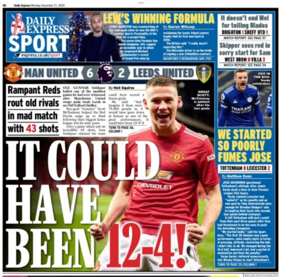 اهتمت الصحف الإنجليزية بالانتصار الكبير الذي حققه مانشستر يونايتد على ليدز بنتيجة 6-2، ضمن الجولة 14 من البريميرليج، إضافة إلى سقوط توتنهام على ملعبه أمام ليستر بهدفين دون رد.