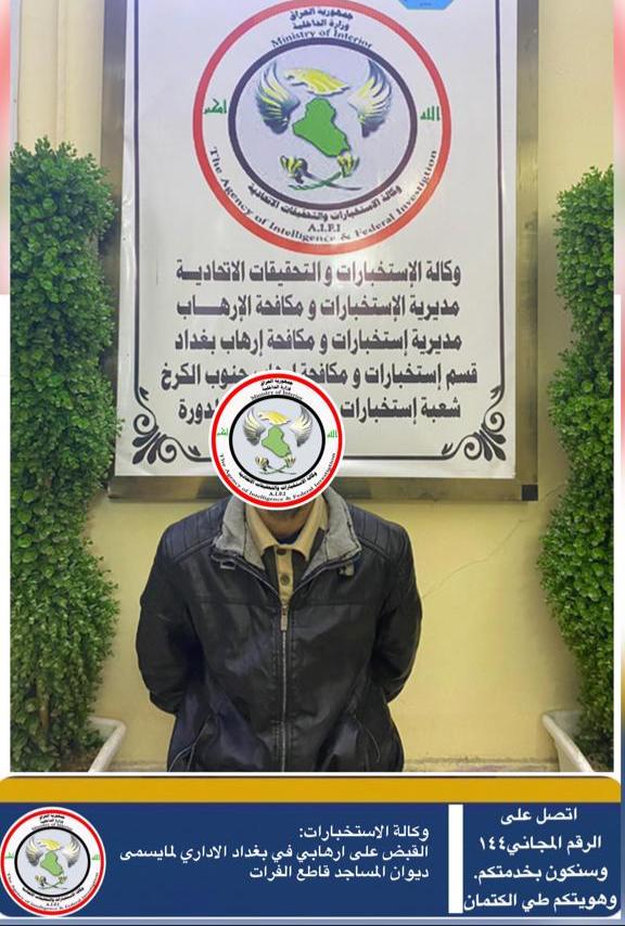 أعلنت وكالة الاستخبارات، اليوم الثلاثاء، القبض على أحد الإرهابيين المطلوب وفق احكام المادة ٤ ارهاب لانتمائه لعصابات داعش والذي عمل بما يسمى قاطع الفرات بمنصب الاداري لديوان المساجد.