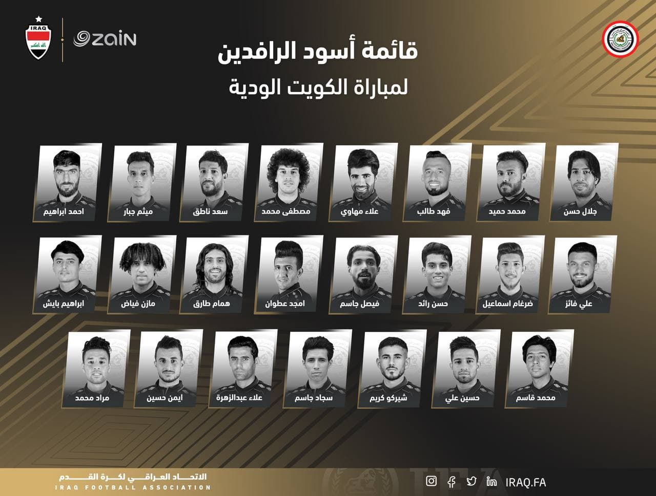 كما ضمت قائمة الأسود اللاعبين: أمجد عطوان وهمام طارق ومازن فياض وإبراهيم بايش ومحمد قاسم وحسين علي وشيركو كريم وسجاد جاسم ومراد محمد لخط الوسط، وعلاء عبد الزهرة وأيمن حسين لخط الهجوم.