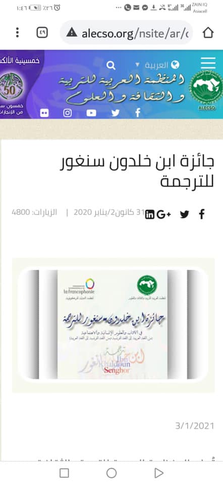 أعلنت وزارة الثقافة والسياحة والآثار عن فتح باب الترشح لجائزة( ابن خلدون-سنغور للترجمة) بدورتها الرابعة عشرة لسنة 2021 وبرعاية المنظمة العربية للتربية والثقافة والعلوم.
