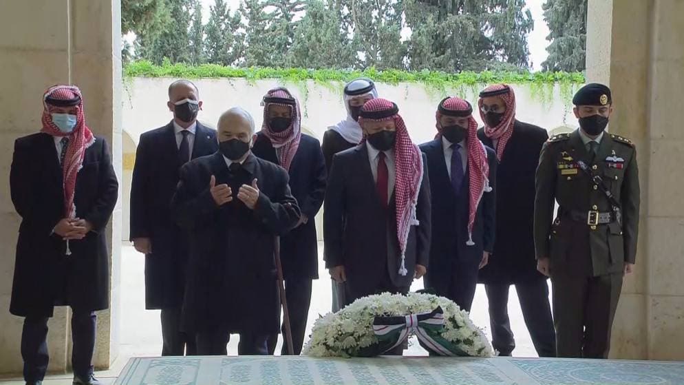 وأظهرت وسائل الإعلام الحكومية، العاهل الأردني وأفرادا آخرين من العائلة الحاكمة يضعون أكاليل الزهور على النصب التذكاري للجندي المجهول.