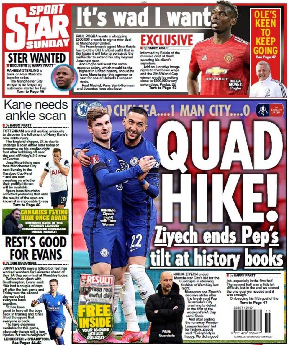 اهتمت الصحف الإنجليزية بتأهل تشيلسي إلى نهائي كأس الاتحاد الإنجليزي، عقب تغلبه على مانشستر سيتي، كما سلطت الضوء على إصابة هاري كين، مهاجم توتنهام هوتسبير.