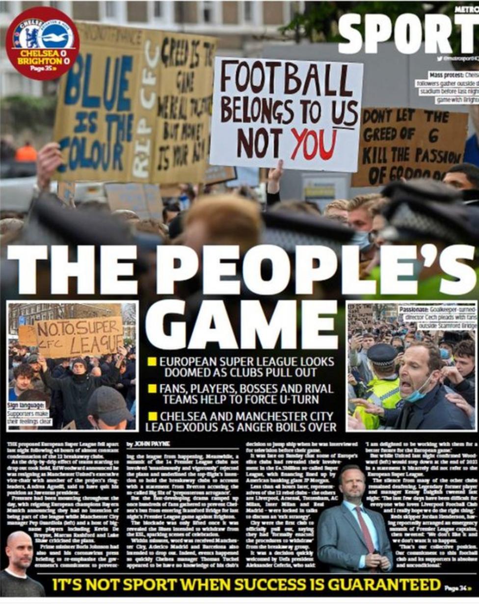 أما صحيفة “ديلي إكسبريس” فعنونت: “انتصار لقوة الجماهير.. مؤامرة دوري السوبر في انهيار بانسحاب تشيلسي والسيتي مع الغضب الشعبي”.