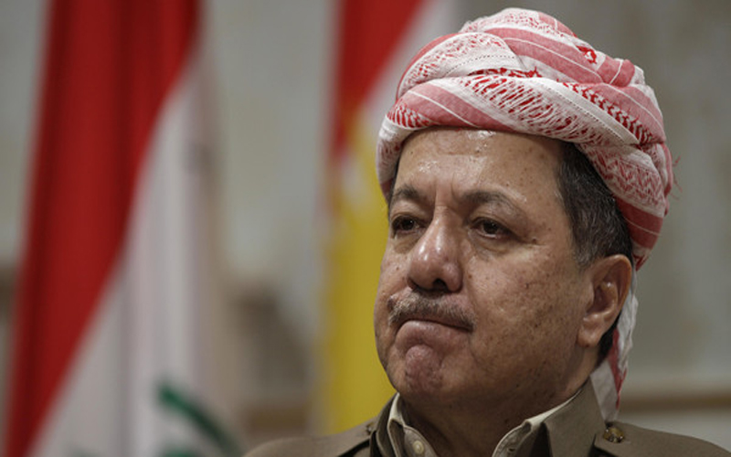 Kurdish president Massoud Barzani reacts during an interview with the Associated Press in Salah al-Din resort, Irbil north of Baghdad, Iraq, Wednesday, April 25, 2012. Barzani told The Associated Press on Wednesday that one possible alternative is a political revolt. He says opposition parties have run out of patience after feeling sidelined in al-Maliki's Shiite-led government. (AP Photo/Khalid Mohammed)
