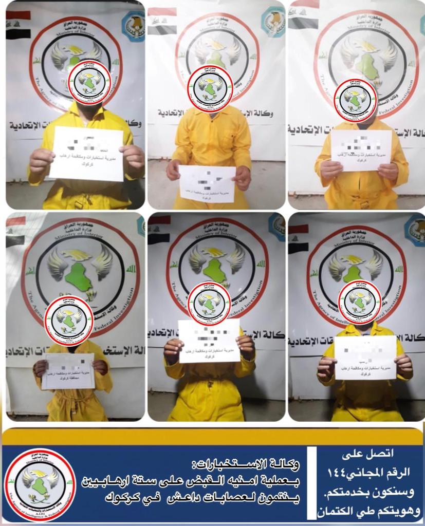 وقال بيان للوكالة تلقت “المراقب العراقي” نسخة منه، إن “من خلال المتابعة المستمرة للأهداف المطلوبة والصادرة بحقهم مذكرات قبض من عناصر عصابات داعش الارهابي وباشراف ومتابعة ميدانية من قبل السيد وكيل الاستخبارات، فقد تمكنت مفارز وكالة الاستخبارات والتحقيقات الاتحادية في وزارة الداخلية من القاء القبض على ستة ارهابيين بمناطق متفرقة من محافظة كركوك مطلوبين وفق احكام المادة ( ٤ ارهاب) لانتمائهم لعصابات داعش الارهابي”.