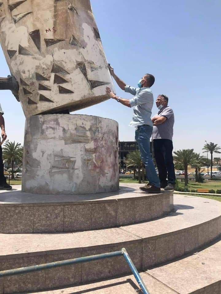 باشر قسم المصاهر في دائرة الفنون العامة التابعة لوزارة الثقافة والسياحة والآثار، بصيانة نصب “إنقاذ الثقافة العراقية” للفنان الراحل محمد غني حكمت.