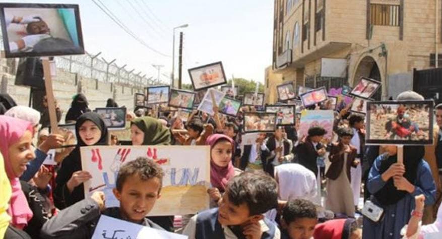 وعلى نفس هذا المنوال، نظم أطفال اليمن أمام مكتب الأمم المتحدة في العاصمة صنعاء يوم أمس الأربعاء، وقفة احتجاجية للتنديد بجرائم العدوان الأمريكي السعودي بحق الشعب اليمني بصورة عامة والأطفال بوجه خاص. ورددَّ الأطفال المشاركون في الوقفة الهتافات الرافضة لقرار أمين عام الأمم المتحدة الذي برأ الجلاد المرتكب لجرائم الأطفال باليمن ووقف إلى جانبه، في حين صنّف المدافعين عن اليمن وأمنه واستقراره بمنتهكي حقوق الأطفال. وقدّموا من خلال رسوماتهم المعبرة رسائل للعالم تكشف وحشية العدوان ومعاناتهم التي يندى لها جبين الإنسانية، لعلّ الصور توقظ الضمائر الميتة.. مطالبين الأمم المتحدة والمجتمع الدولي بتحمل المسؤولية في الضغط باتجاه إيقاف العدوان ورفع الحصار عن اليمن.