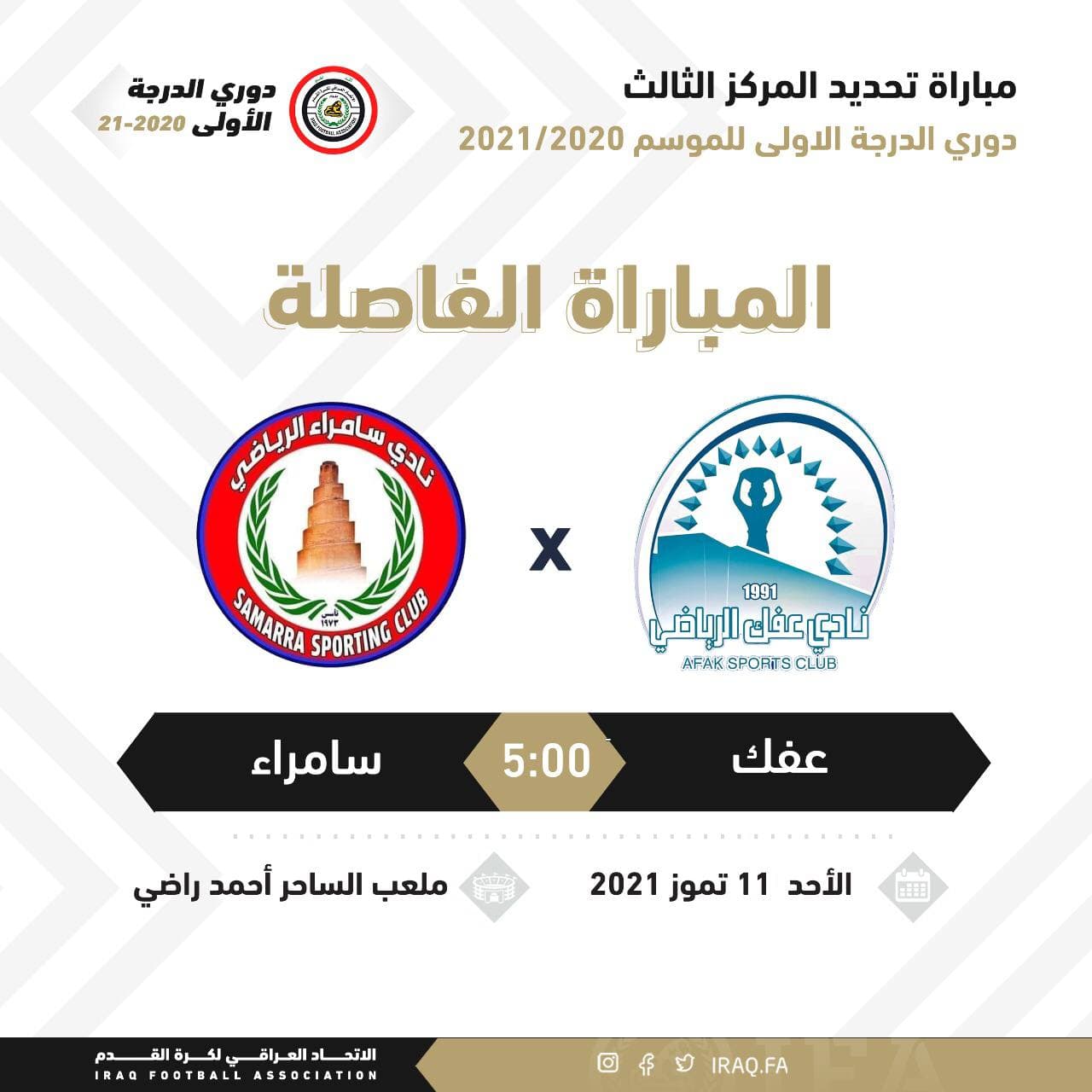 أعلنت لجنة المسابقات في الهيئة التطبيعية، عن تحديد موعد مباراة فريقيّ عفك وسامراء في دوري الدرجة الأولى لكرة القدم، لتحديد المركز الثالث الفائز في البطولة.