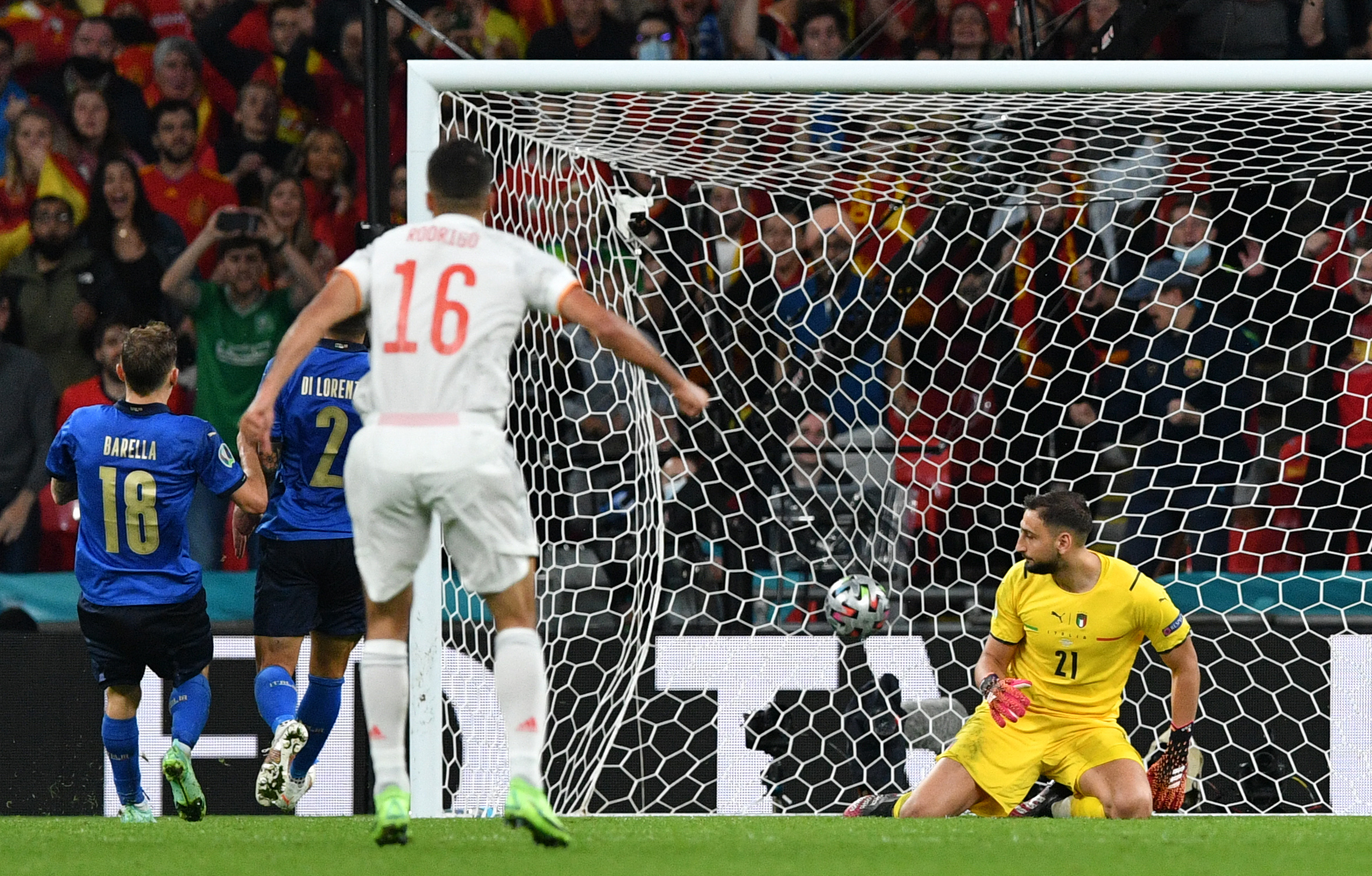 خطف منتخب إيطاليا بطاقة التأهل للمباراة النهائية ببطولة كأس أمم أوروبا، عقب الفوز على إسبانيا بركلات الترجيح بنتيجة (4-2)، بعد نهاية الوقت الأصلي والإضافي بالتعادل (1-1) في نصف نهائي المسابقة.