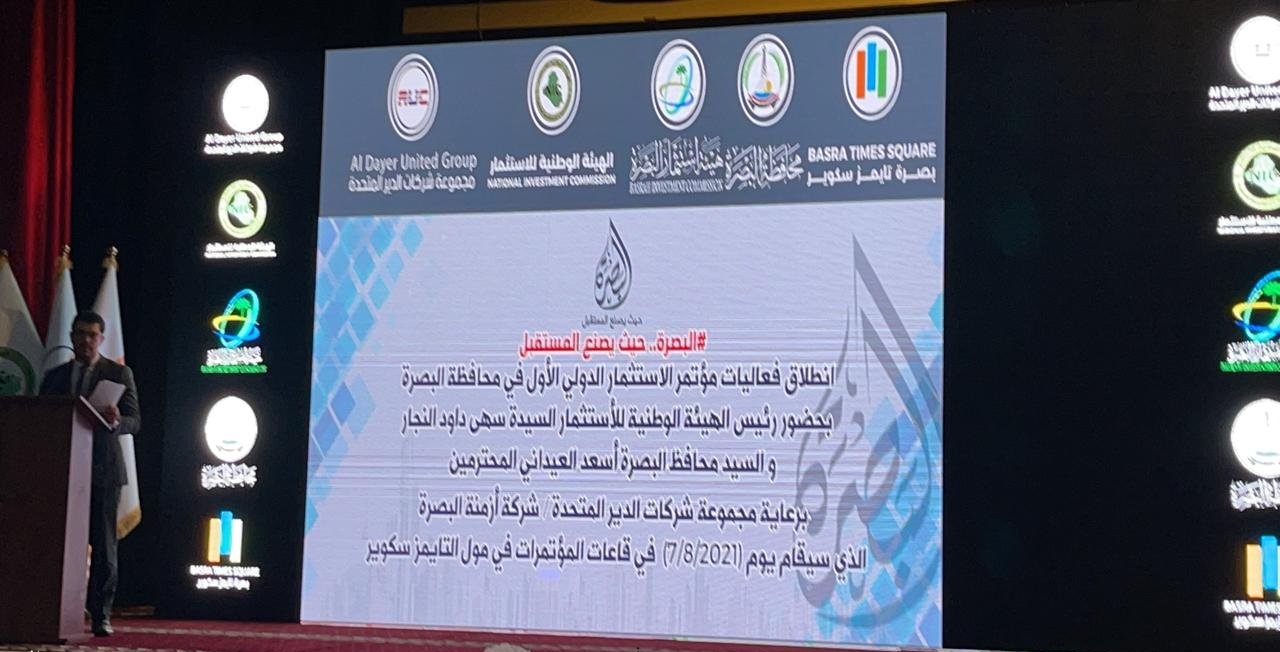 انطلقت صباح امس السبت فعاليات مؤتمر الاستثمار الدولي الاول في البصرة ، بحضور محافظ البصرة اسعد العيداني ورئيسة الهيئة الوطنية للاستثمار سهى النجار ، بمشاركة عدد من الشركات الاستثمارية .