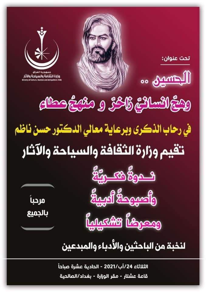 وذكر بيان للوزارة تلقته (المراقب العراقي) :ستقيم وزارة الثقافة والسياحة والآثار في الساعة الحادية عشر من يوم غد الثلاثاء 24/8 على قاعة عشتار بمقر الوزارة ، فعاليات متنوعة تتضمن ندوةً فكريةً ثقافيةً، وأُصبوحةً أدبيةً ومعرضاً تشكيلياً تحت عنوان (الحسين وهج إنساني زاخر ومنهج عطاء) .