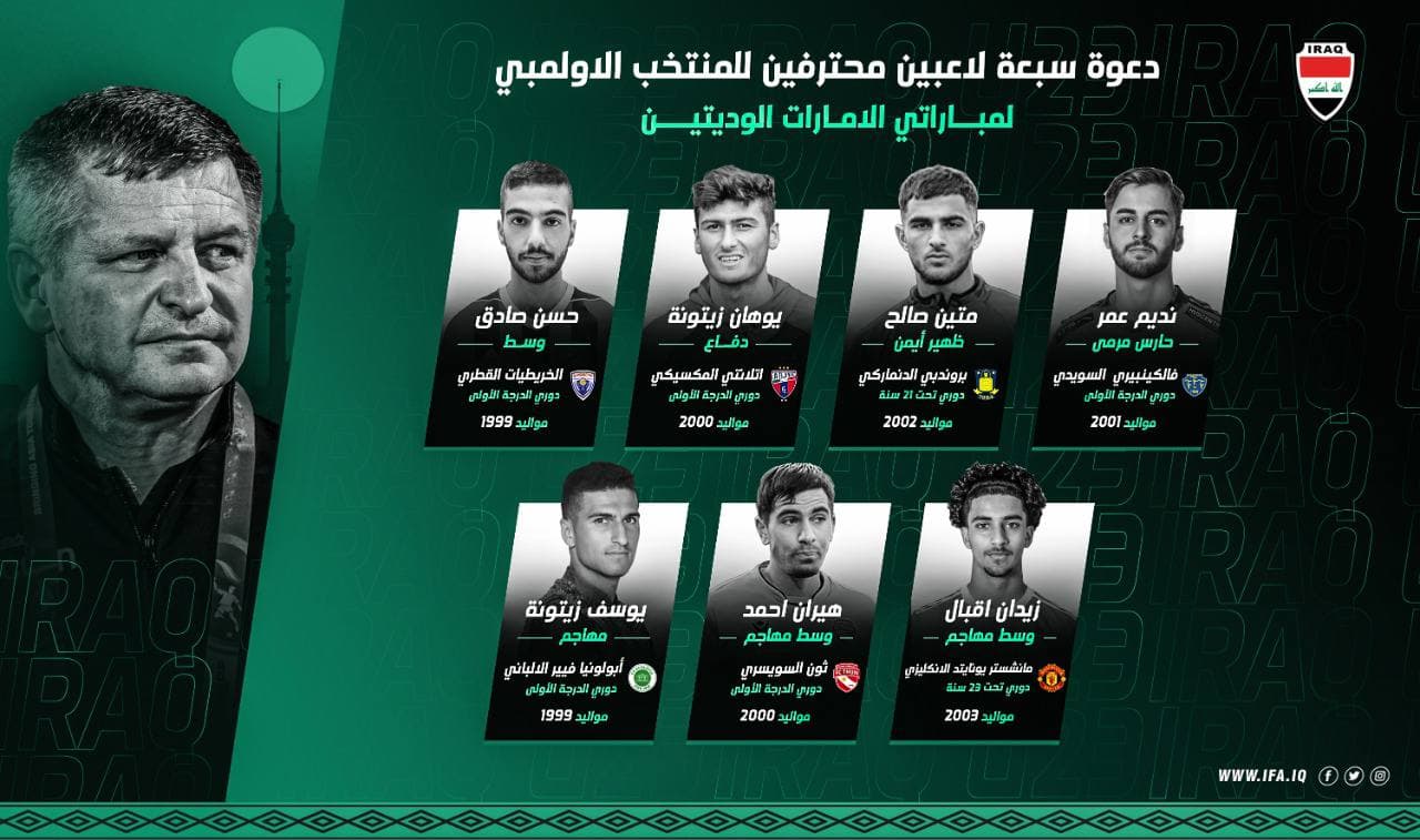 وجهَ مدرب منتخب الأولمبي لكرة القدم، التشيكي ميروسلاف سوكوب، الدعوة لسبعة لاعبين محترفين للتواجد مع المنتخب لخوض وديتي الإمارات بالرابع والسادس من الشهر المقبل، ضمن تحضيراته للاستحقاقات المقبلة.