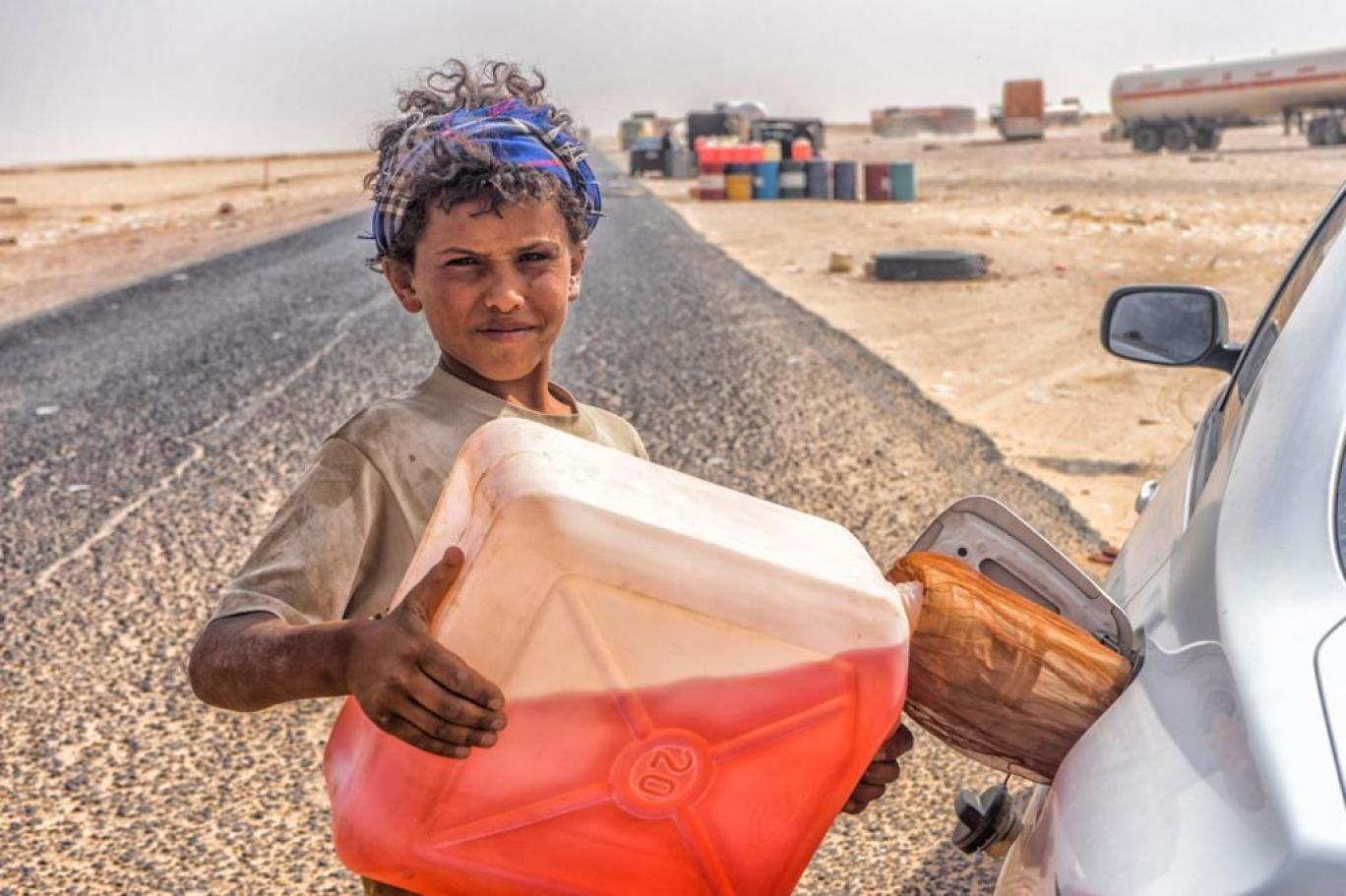 في إحدى الصور التي فازت على مستوى الشرق الأوسط في مسابقة أقيمت في دبي، يظهر فتى ممسك بجالون مملوء بالبترول في إحدى أسواق الوقود السوداء في اليمن كتجسيد حي يوثق أبعاد الأزمات التي كانت إحدى تمظهرات الحرب وتداعياتها الكارثية على السكان.