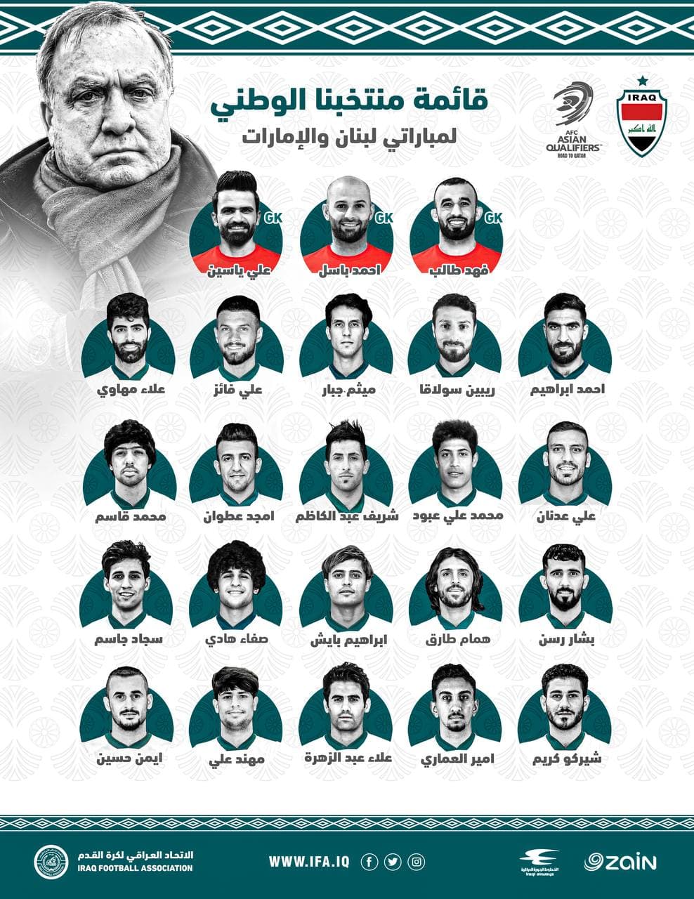 أعلنَ مدرب منتخبنا الوطني لكرة القدم، الهولندي ديك ادفوكات، قائمة المنتخب التي ستخوض مباراتي لبنان والامارات بالسابع والثاني عشر من الشهر الحالي ضمن مباريات المجموعة الاولى للتصفيات الآسيوية المؤهلة لمونديال قطر 2022.