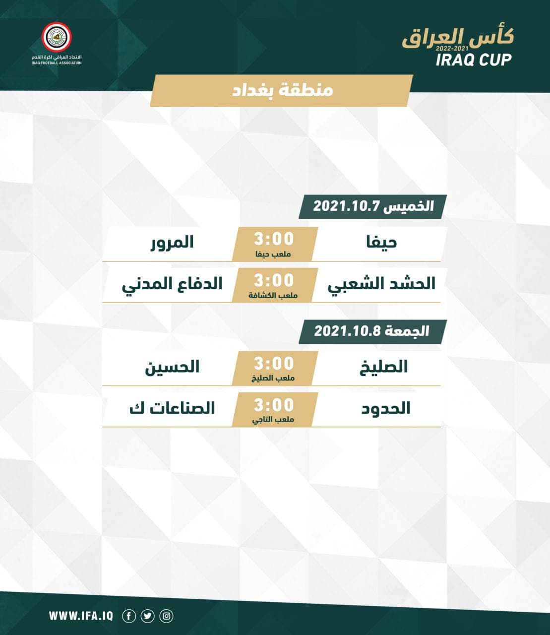 وأسفرت القرعة، التي أجريت بحضور ممثلي الأندية، عن المواجهات الآتية لأندية بغداد: حيفا يلتقي المرور والحشد الشعبي يواجه الدفاع المدني والصليخ بمواجهة الحسين والحدود يلاعب الصناعات الكهربائية، فيما سيكون فريق الجنسية والمصافي بوضع الانتظار.