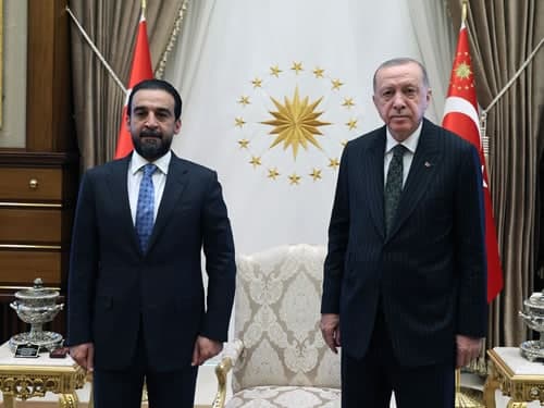 ودخلت تركيا، على خط التحالفات الانتخابية في العراق وللمرة الأولى، إذ توسط رئيسها علناً وجاهر باستقبال زعيمَي أكبر كتلتين سنيتين. ففي مشهد بدا مفاجئاً، وزّعت الرئاسة التركية صورتين، الأولى لأردوغان مع الحلبوسي، والأخرى مع الخنجر. ولم يصدر لا عن الرئاسة التركية ولا عن الحلبوسي أو الخنجر، بيان أو تصريح بشأن الاجتماعين.
