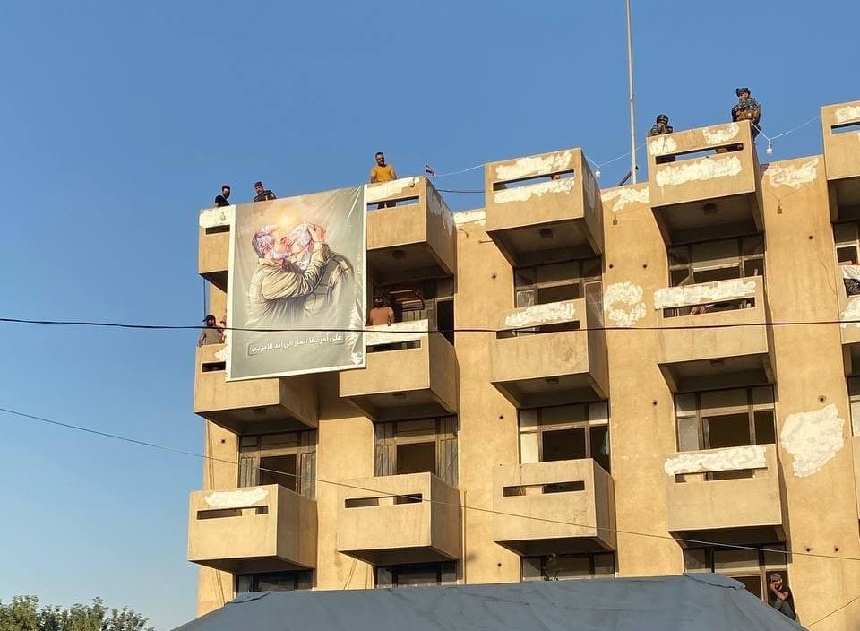 واظهرت صور نشرت على مواقع التواصل وتابعتها “المراقب العراقي” قيام المتظاهرين المرابطين عند بوابات الخضراء على خلفية التزوير الذي طال نتائج الانتخابات برفع صورة جمعت بين الشهيدين ابو مهدي المهندس وقاسم سليماني.