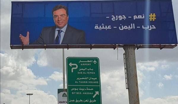 نشر الناطق باسم حركة “أنصار الله” في اليمن، محمد عبد السلام، على حسابه في “تويتر” صورتين للافتة عليها صورة وزير الإعلام اللبناني، جورج قرداحي، تم وضعها في العاصمة اليمنية صنعاء.