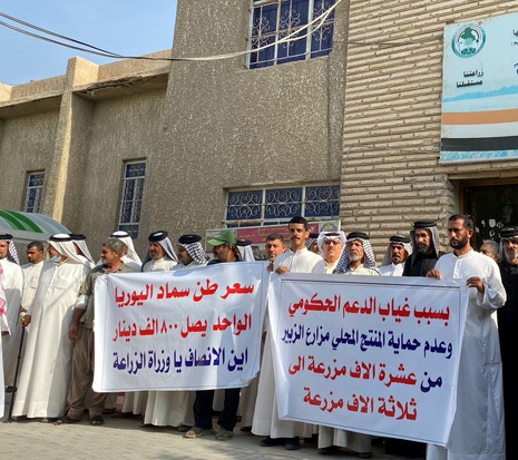 وذكر رئيس الجمعية الفلاحية في قضاء الزبير رياض شداد طالبا من خلال وقفتنا الاحتجاجية امس الحكومة المركزية ووزارة الزراعة بدعم الفلاحين والمزارعين بزيادة الحصة من سماد الداب وعدم وتخفيض حصة سماد اليوريا التي وصلت الى 800 الف دينار للطن ورفع اسعار الأسمدة الى الضعف. التي تسببت بتعرض المزارعين الى خسائر كبيرة في التكلفة والانتاج نتيجة انعدام الدعم وارتفاع الأسعار في الاسواق.