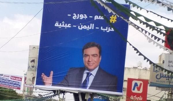 علّق يمنيون في صنعاء، صورا لوزير الإعلام اللبناني جورج قرداحي.