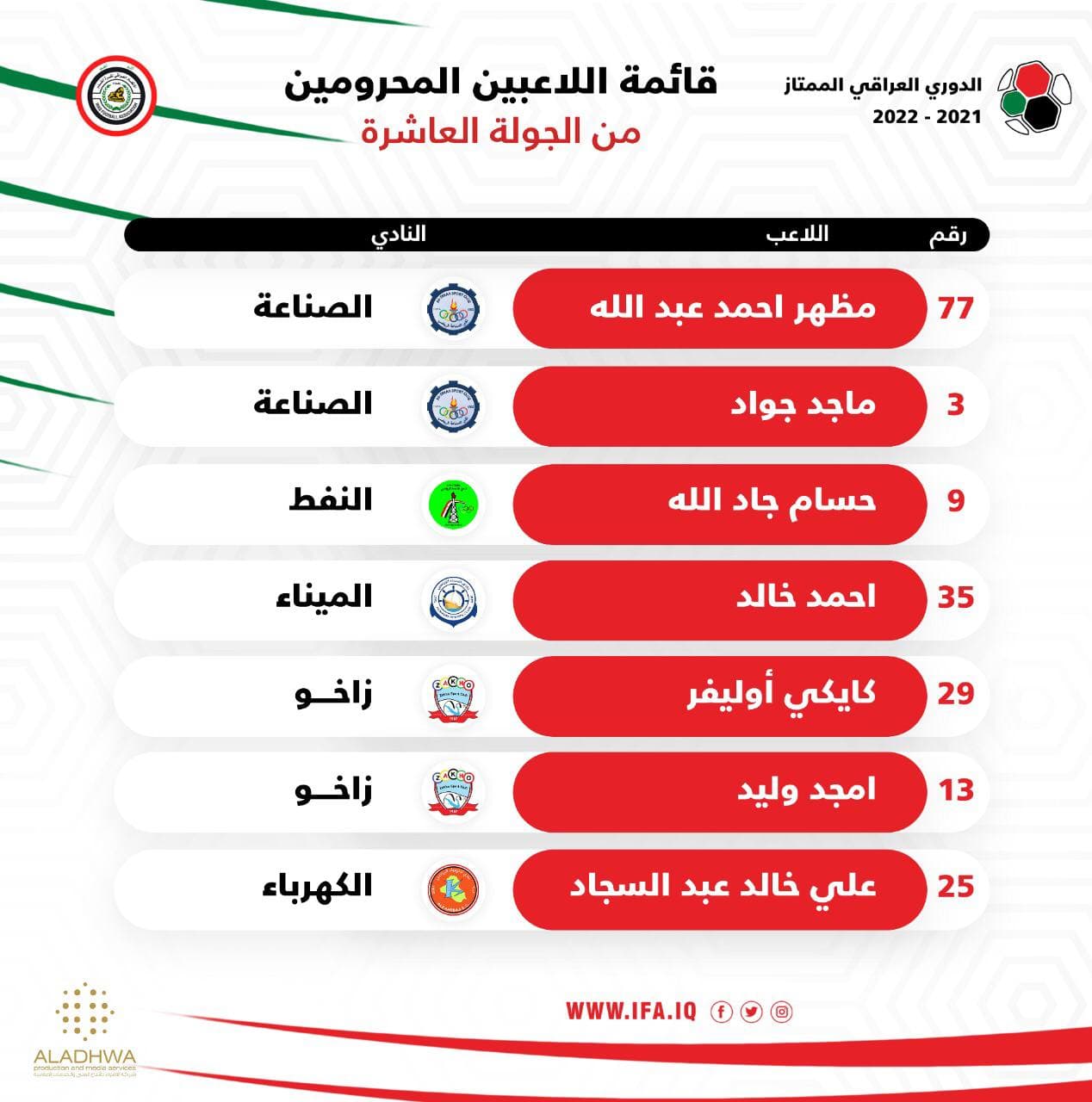 وسيغيب عن الجولة العاشرة من نادي الصناعة الثنائي مظهر حمد وماجد جواد، كما سيفقد نادي النفط لاعبه حسام جاد الله.