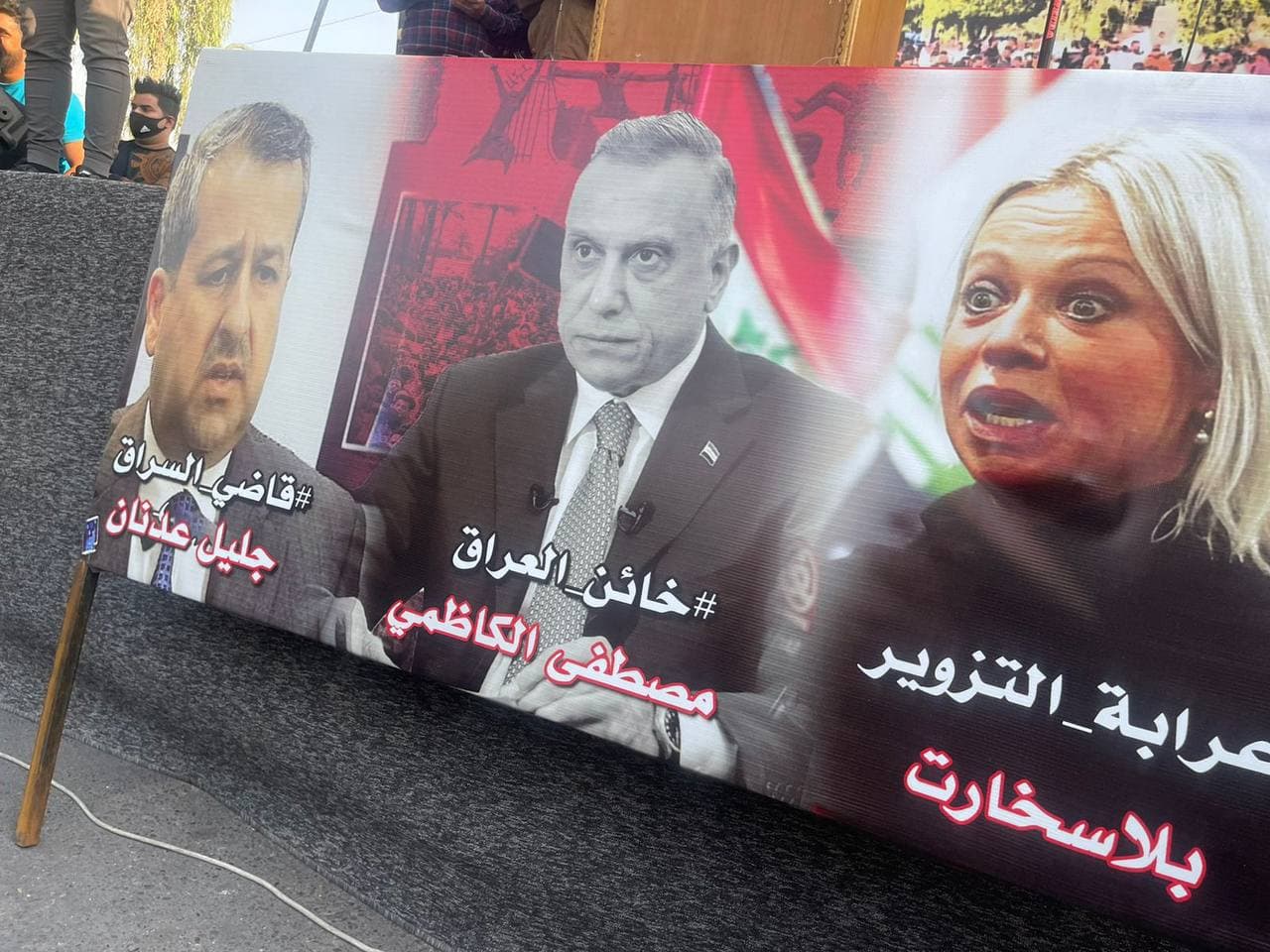 ورفع المحتجون لافتات منددة برئيس حكومة تصريف الأعمال مصطفى الكاظمي، ورئيس مفوضية الانتخابات جليل عدنان، وممثلة الأمين العام للأمم المتحدة في العراق جينين بلاسخارت ، متهمين هؤلاء بالوقوف وراء عمليات التلاعب بنتائج الانتخابات.