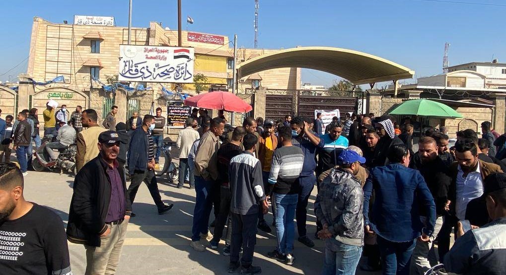 موظفو العقود يغلقون دائرة صحة ذي قار للمطالبة بفروقاتهم المالية
