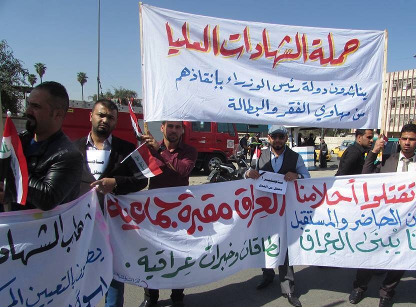 وقال ارشد الناصري، احد المتظاهرين في تصريح تابعته” المراقب العراقي” انه “مضى على تخرجهم سنوات عديدة واغلبهم من حملة شهادة الماجستير والدكتوراه وفي اختصاصات مختلفة الا انهم لم يحصلوا على فرص التعيين”.