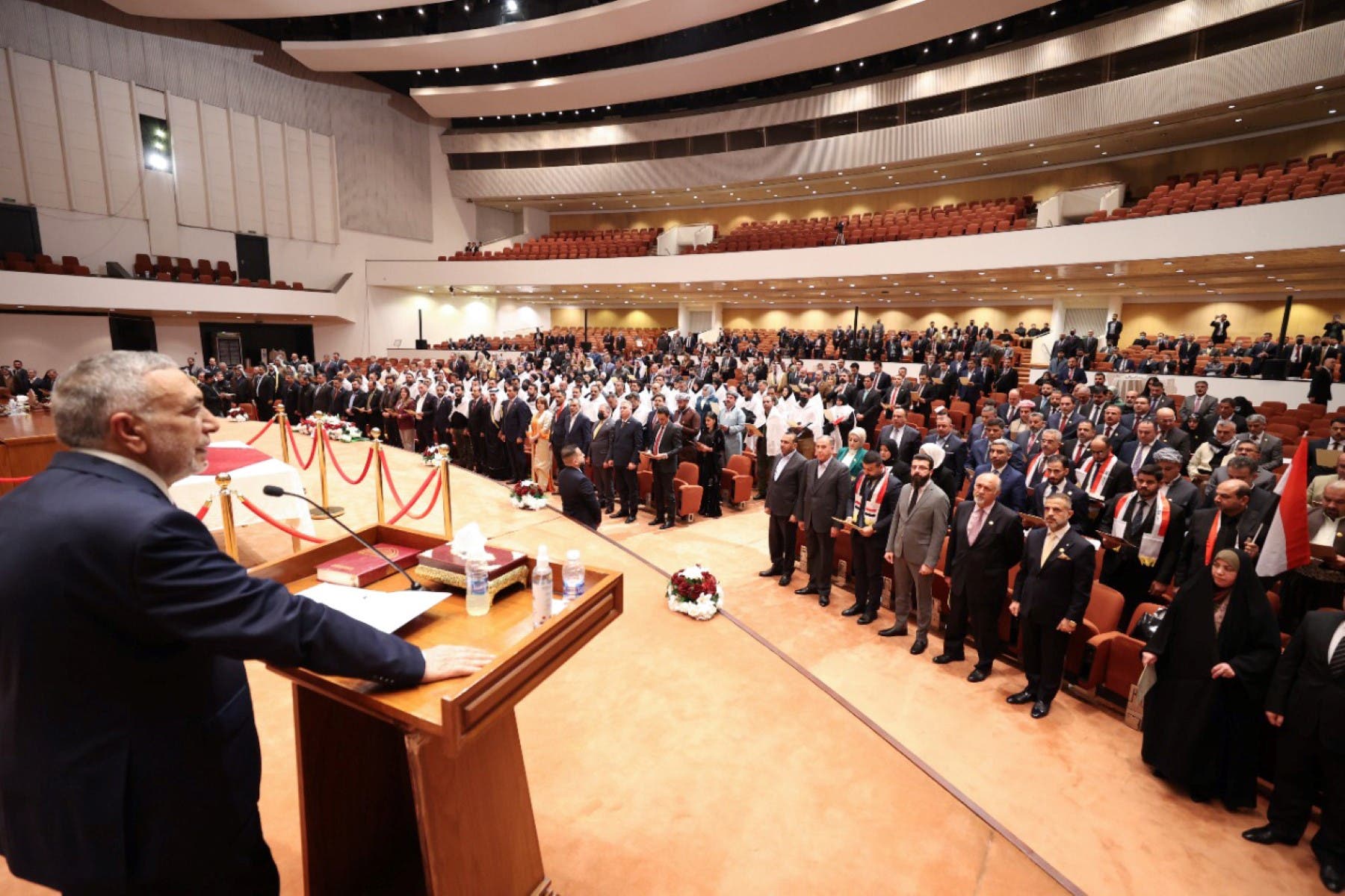 وسجلت الجلسة الأولى للبرلمان، موجة من الفوضى بعد الاعتداء على رئيس السن محمود المشهداني وإلحاق أضرار صحية به، وكذلك خرق دستوري غير مسبوق من خلال استمرار عقد الجلسة برئاسة النائب الأكبر سنا دون تخويل المشهداني، وكذلك التصويت على محمد الحلبوسي رئيسا للبرلمان لولاية ثانية والقيادي في التيار الصدري حاكم الزاملي نائبا أول والقيادي في الحزب الديمقراطي الكردستاني شاخوان عبدالله نائبا ثانيا لرئيس البرلمان.