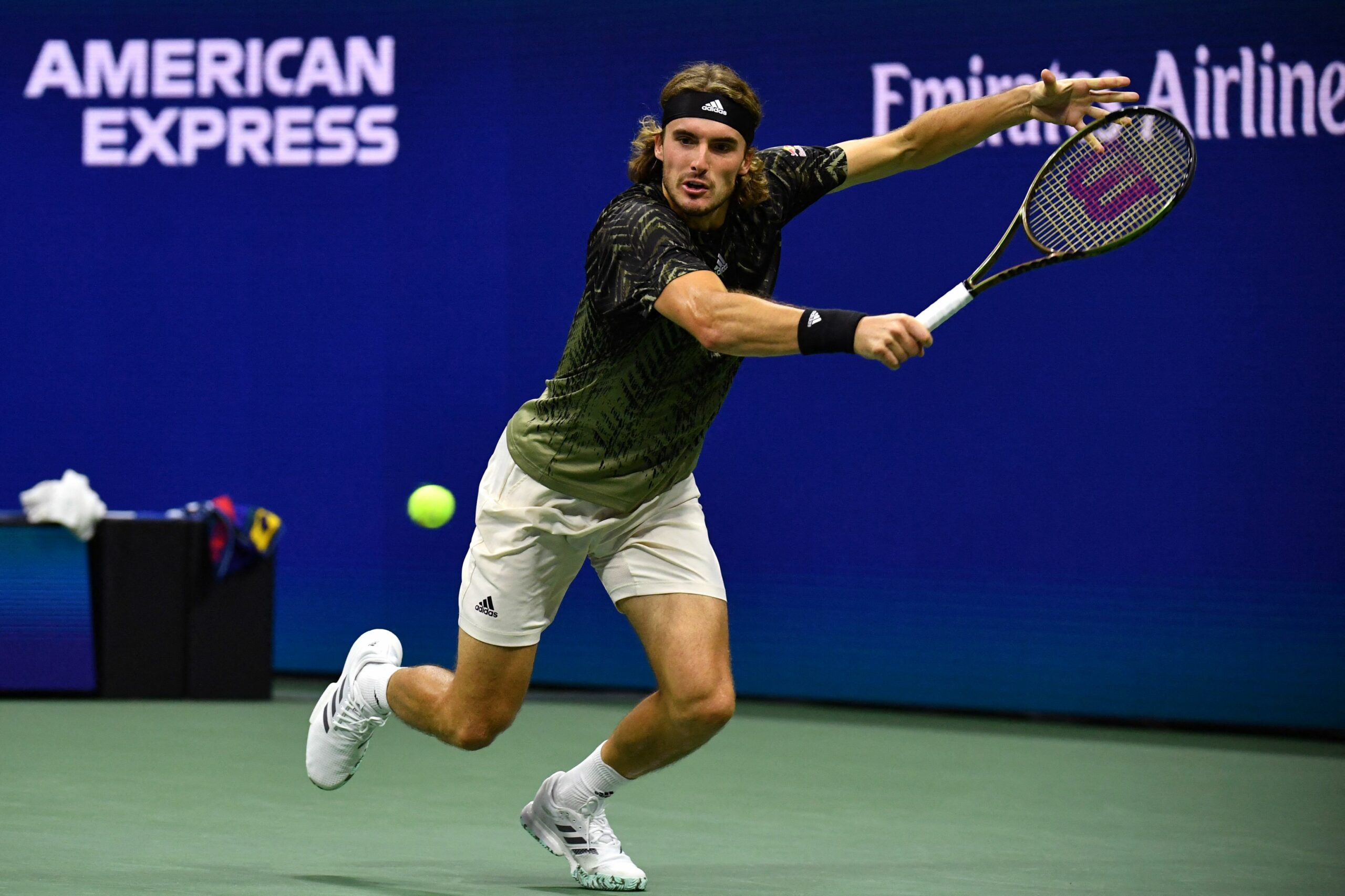Greece's Stefanos Tsitsipas hits a return to France's Adrian Mannarino during their 2021 US Open Tennis tournament men's singles second round match at the USTA Billie Jean King National Tennis Center in New York, on September 1, 2021. (Photo by Ed JONES / AFP)