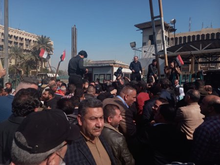 موظفو شبكة الإعلام يتظاهرون أمام أمانة بغداد للمطالبة بقطع أراضٍ